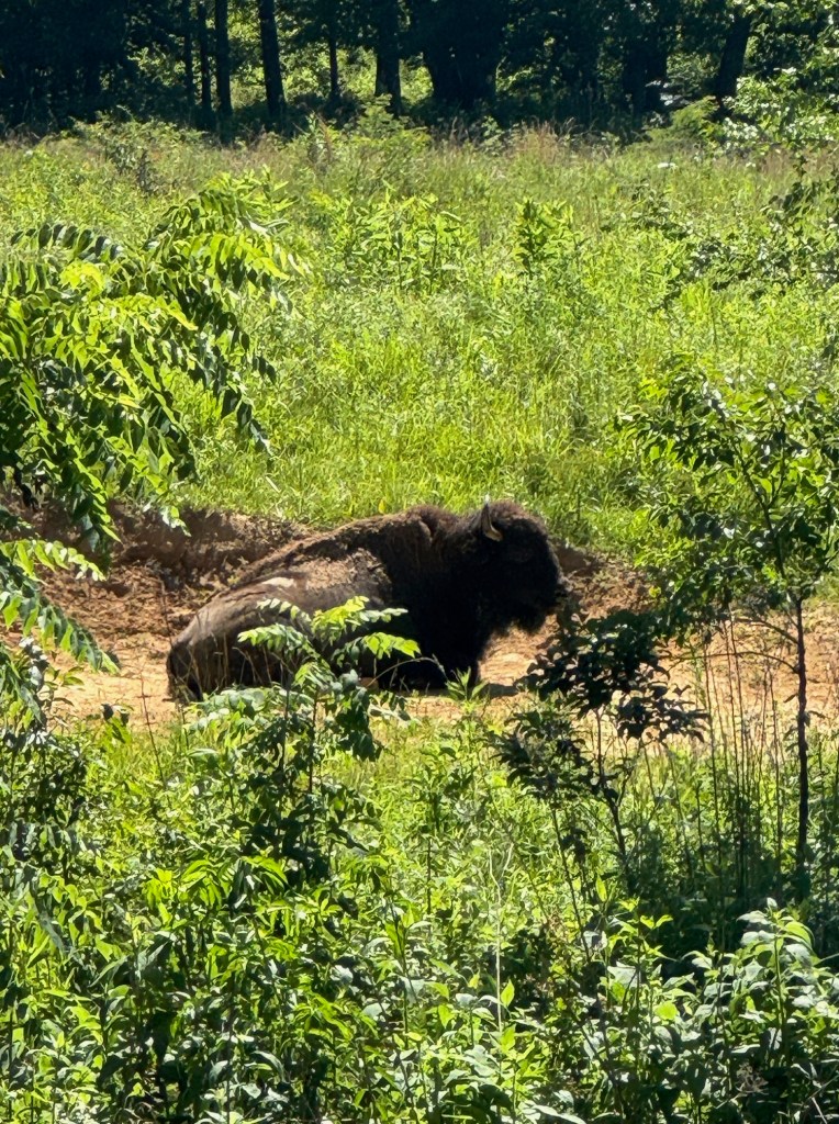 A part of Land Between the Lakes near the town of Golden Pond has been restored to its original condition with a prairie populated by a herd of bison and elk, so that’s where we headed. Unfortunately, we were there mid-afternoon when any sensible large mammal would be resting in the shade on nearby trees, so we saw nothing on the prairie. However, we were lucky enough to spy a bison cow with her calf resting near the road!