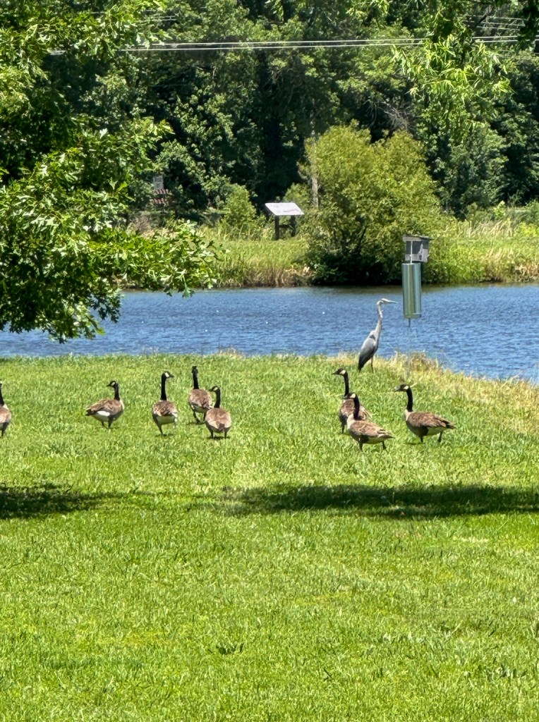 RN: After a day of history and awesome quilts, we decided to commune with nature. We discovered that Clarks River Wildlife Sanctuary and the Land Between the Lakes were nearby, so off we went with our binoculars! The wildlife sanctuary was well-hidden- very few signs off the main road, but we eventually managed to find the parking lot of its education center with its set of short trails around a pond and through the wetlands. The pond looked deserted, so we opted for the wetland trail, which was a 1 mile loop. Sadly, there were no birds to be seen because the “wetlands” had turned into “drylands.” In fact, the best waterfowl we saw were near the parking lot where we started: a group of Canada geese and a great blue heron (see photo below). I can hear Alan Willard blowing a raspberry right now…