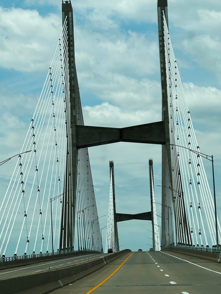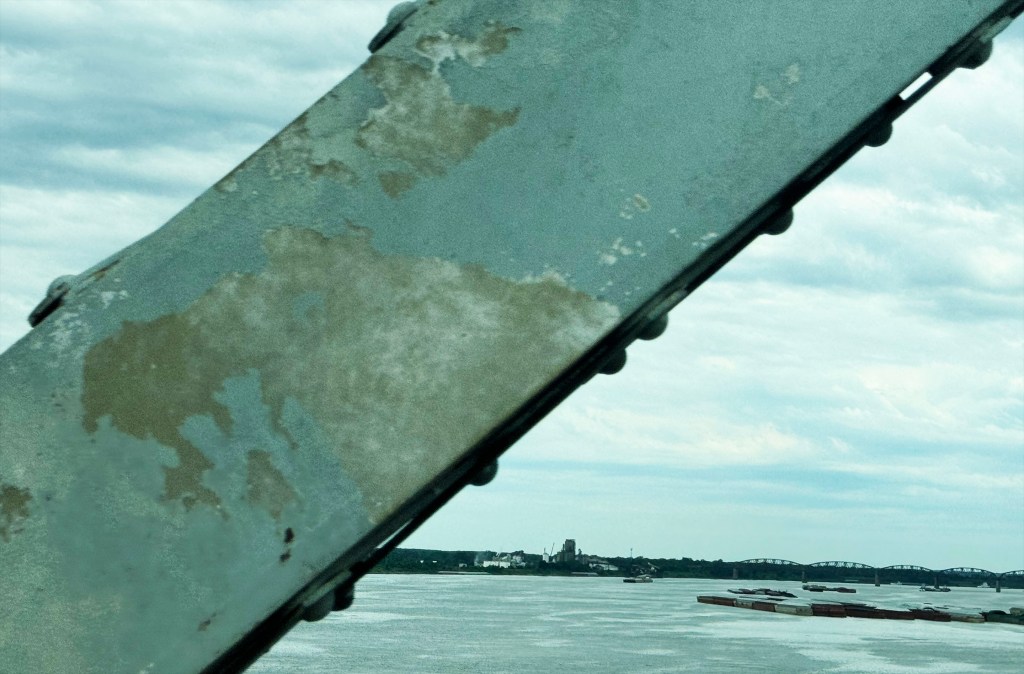 Further on, more rivers and bridges, going from the Ohio to the Mississippi. The pictures below (both bridges span the Mississippi) illustrate the difference between the crushing poverty of Southern Illinois, and the increasing prosperity of the area closer to St. Louis.