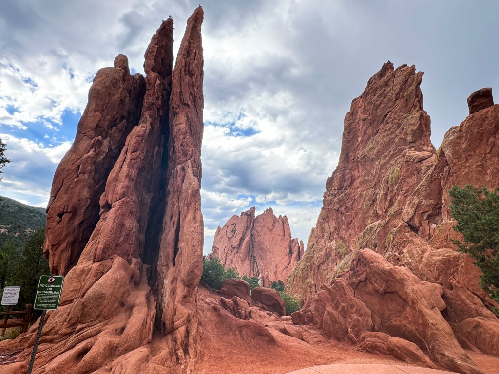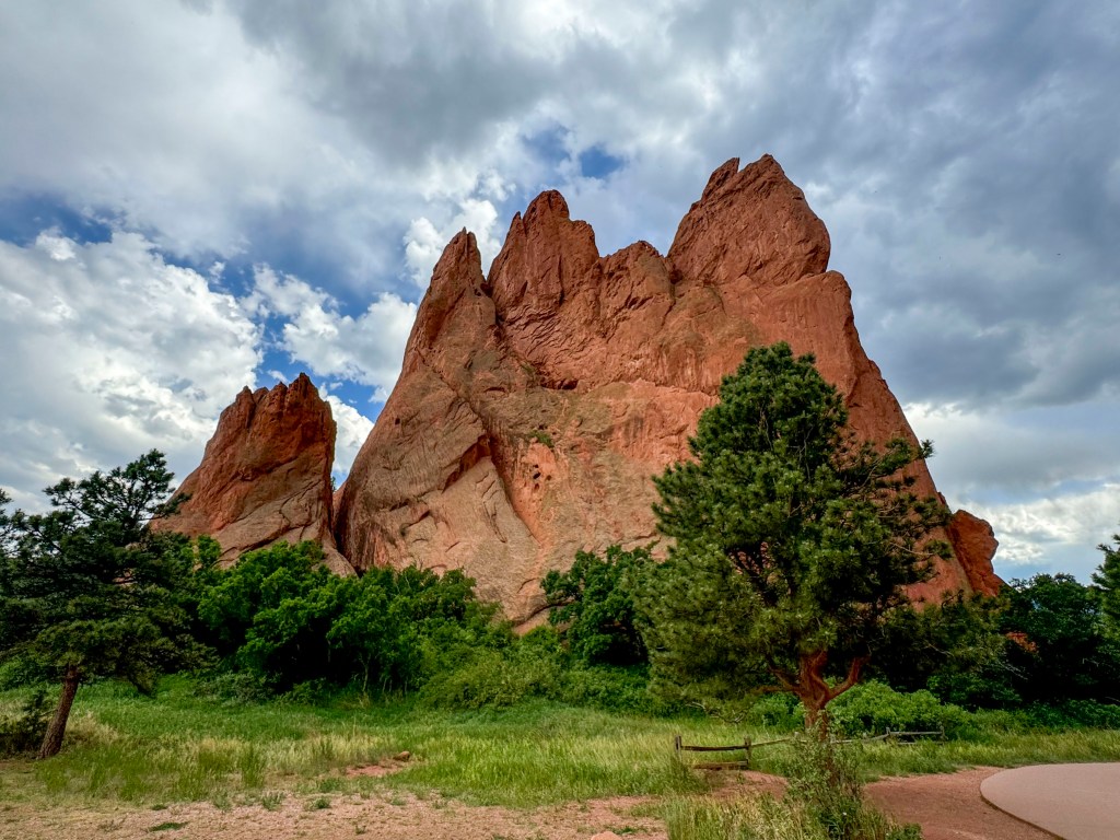 RN: Garden of the Gods, a National Natural Landmark, is in Colorado Springs CO.  Archeology shows that it was visited by prehistoric people as early as 1350 BC and many native tribes have reported a connection to it: Apache, Cheyenne, Comanche, Kiowa, Lakota, Pawnee, Shoshone, and Ute (Wikipedia). It was later visited by various European “invaders” and ultimately purchased (from whom?) in 1879 by Charles Perkins who bequeathed it to Colorado Springs on the condition that it remain a free public park for all to enjoy. Many of the rock formations are confined within a small area that is accessible via a wide paved path.  Since we didn’t have time to hike a long distance (we arrived at 4:30 pm), we stuck to the paved trail but there was a lot to see!!