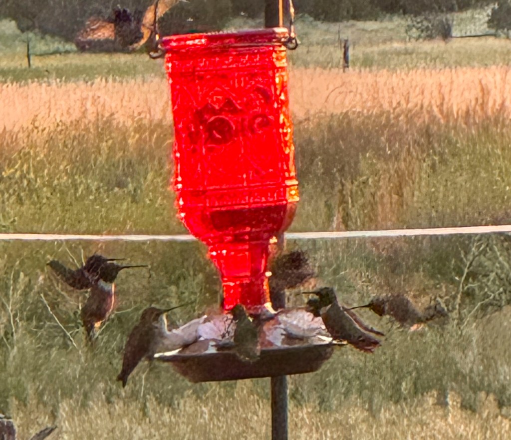 I Googled “What is a group of hummingbirds called,” and learned it is called a charm. Seems that the black chinned variety are a lot more “charming” than the ruby-throaters.