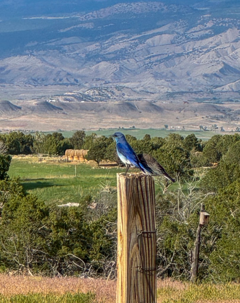 RN: I was standing in front of our cabin, admiring the view, when a western blue bird flew in and perched on a post. If you look to its right, you will see its gray fledgling, which was harassing it to be fed. It turns out the property has lots of blue birds flying around- they are a gorgeous hue of brilliant blue.