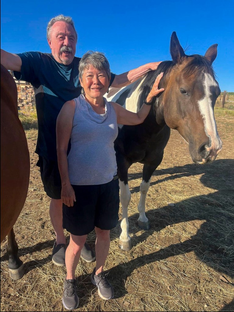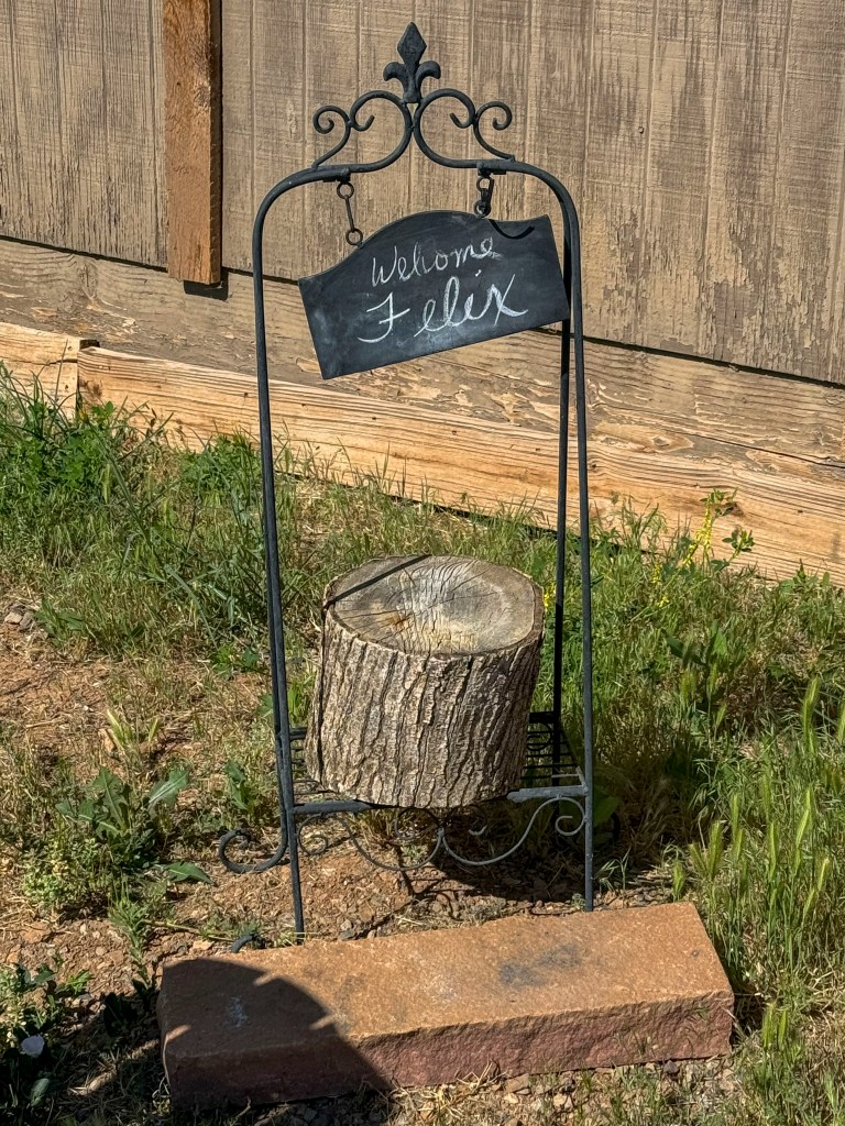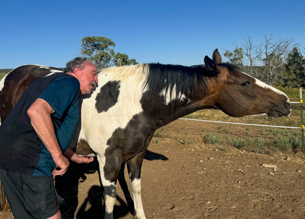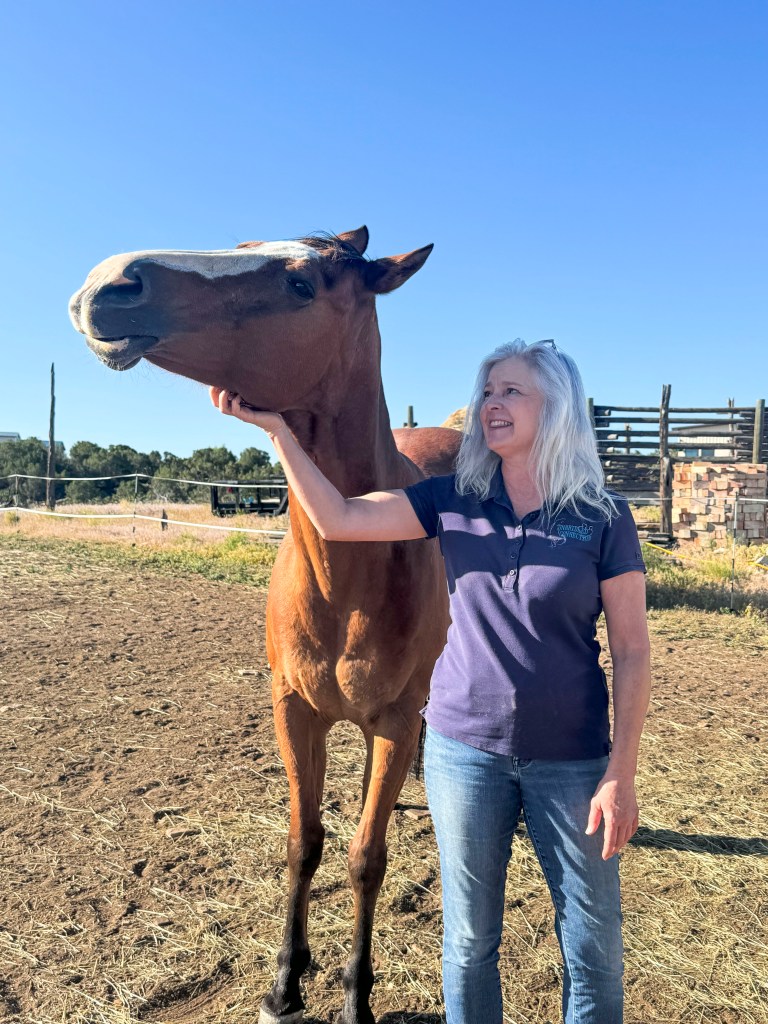 RN. Bright and early in the morning (7:30- that’s early for us), we met Kelly in the corral so she could introduce her 4 horses Leada (sp? Well, she is the leader of the group), Fancy, Cheyenne, and we forgot one name (sorry, Kelly).  At any rate, we had previously appreciated horses for their ability to let us ride them and had occasionally fed others a carrot and patted them on their head, but basically thought of them as pretty out of touch with humans.  Well, Kelly showed us otherwise.  We walked into the corral to meet the horses and discovered how different their personalities were and how they could interact with us just like any dog or cat we’ve met.  When we got absorbed talking to Kelly about her therapy practice (using horses to help humans heal from trauma), Leada decided to push herself between Kelly and us because she wanted to tell us that was enough human conversation and that we should be interacting with the horses.  Then Fancy came along and started bonking me with her head and trying to nuzzle me and effectively made Felix and me a horse sandwich between herself and Leada.  Fortunately, I kept my cool (although Kelly told me I should have told the horses I was afraid of them).  At any rate, I made good friends with both horses and saw how they could knowingly look you in the eye.  Kelly also showed us where horses touch each other (near the shoulder) and where they loved to be scratched the most.  When you scratched their favorite spot, they would stretch their neck out, partially close their eyes and were obviously very pleased.  Felix made great friends with Fancy this way.