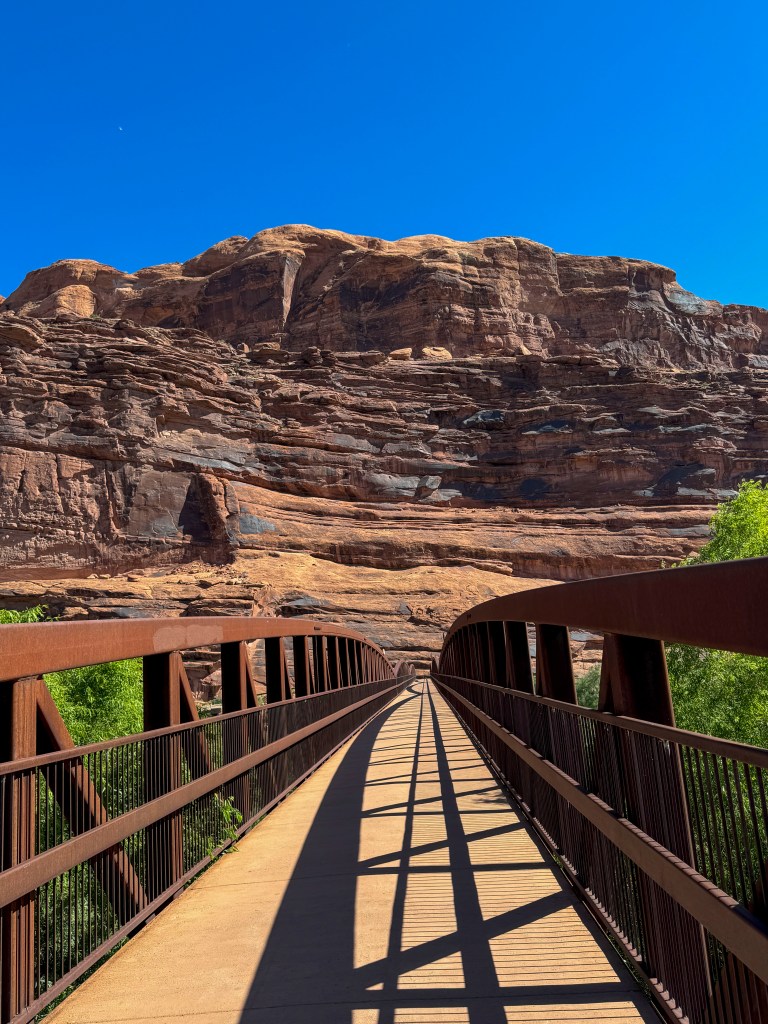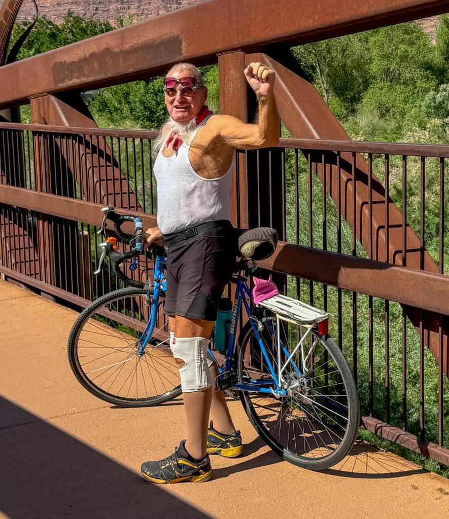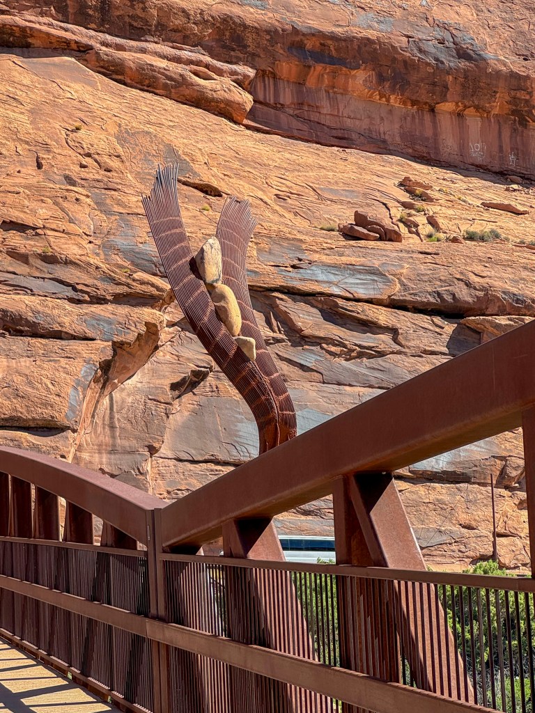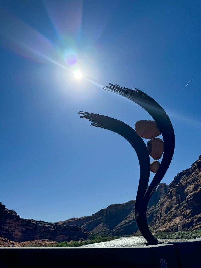 FE: Before we leave Moab, we take a short walk over the Colorado River Bike Bridge at a city park near our hotel, experiencing the full power of the winds blowing down the canyon that are so strong that an old geezer has to walk his bike, but shows off for us (he tells us he is “76 and holding!”). The bike path goes up and past Arches National Park, what a ride. Beauty all around us, the sculptures on the bridge perfectly capture the spirit of the canyon, and folks play in the river, even on jet boats.