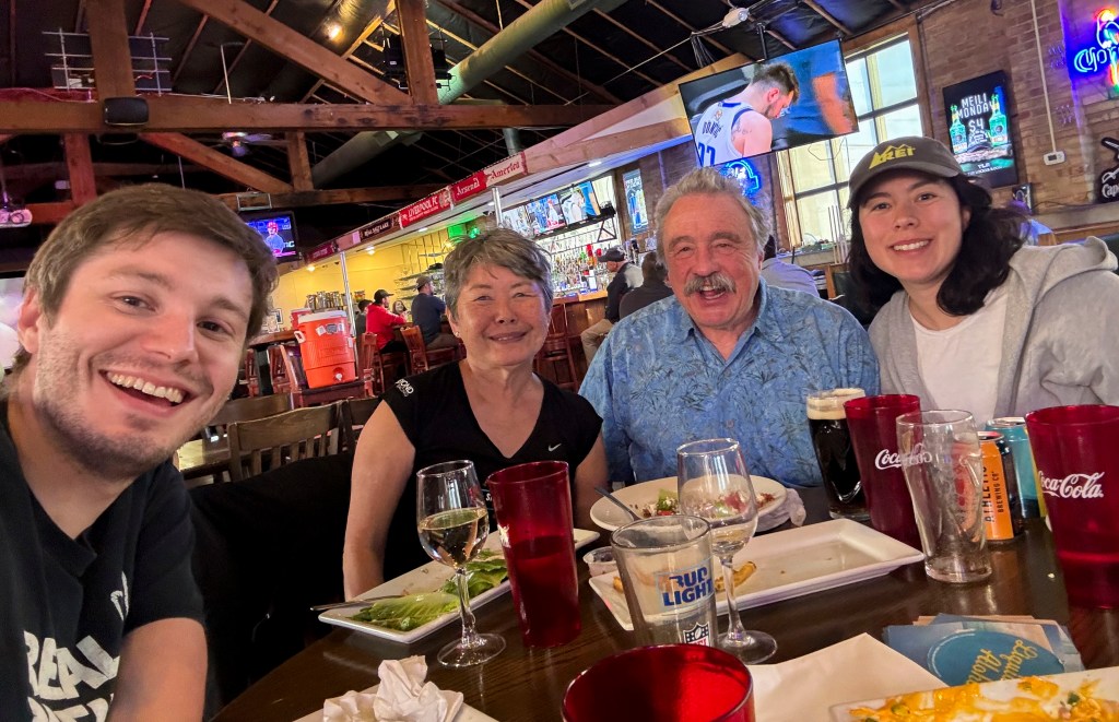 FE: Here we are, reunited with Mimi and Alex, having a good time in a sports bar…..yay- go Celtics…notice dejected Luka Doncic on the screen behind Felix.