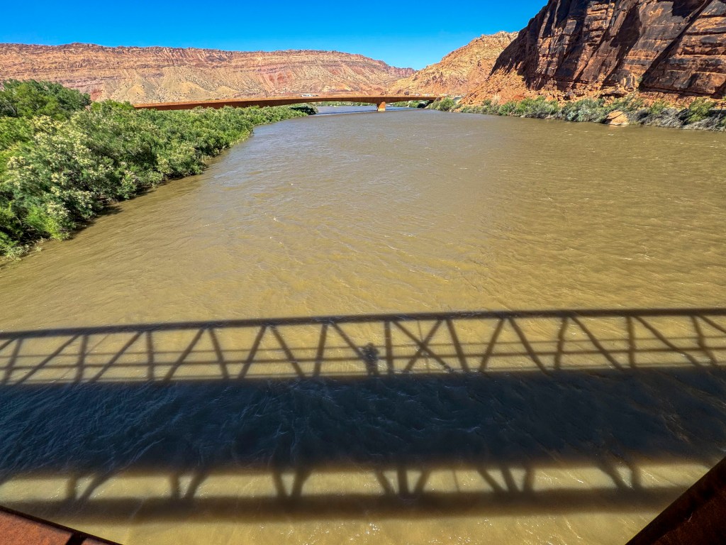 Shadows of the Colorado River bridge near Moab with shadow selfie of photographer