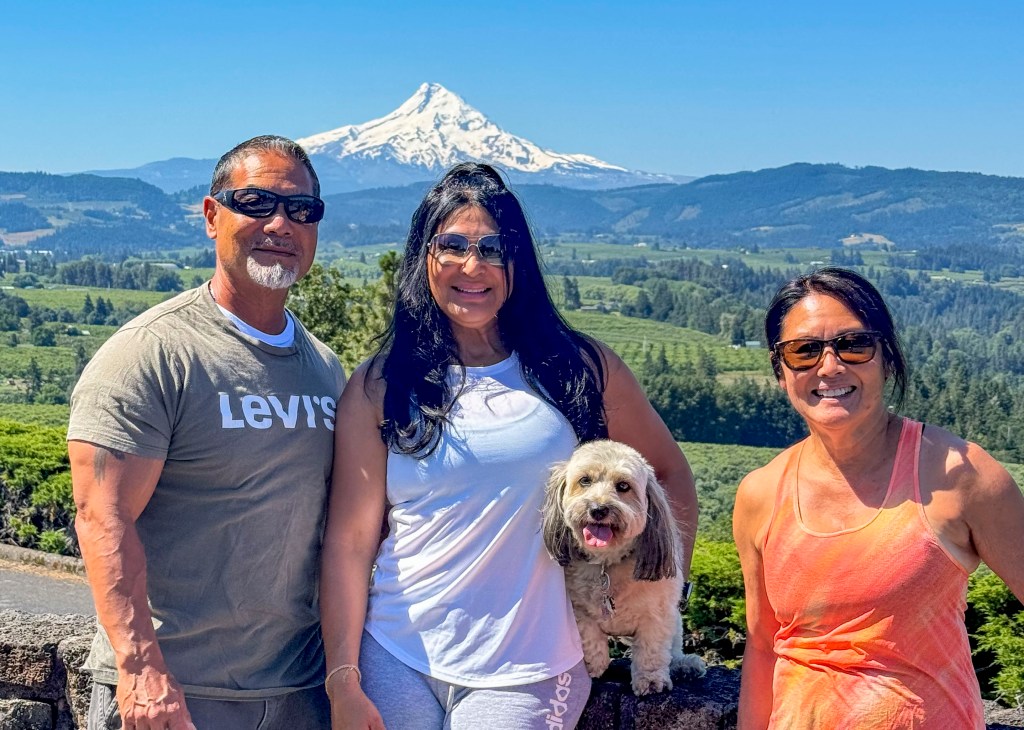 Albert, Nancy, Marley (four legs) and Naomi are enjoying the spectacular view at Panorama Point over orchards, vineyards and Mt Hood
