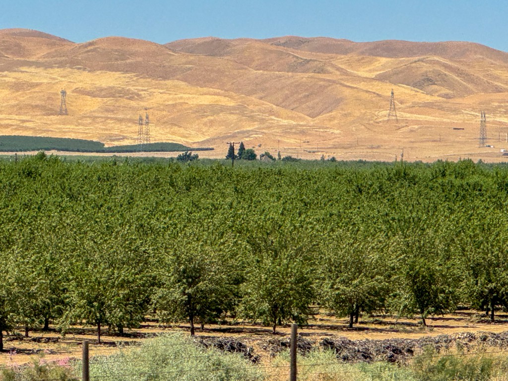 RN: As we drove through the Central Valley we were impressed by the contrast between the very green crops and the parched landscape around them (the photo below shows almond trees).  The Central Valley provides 25% of the food consumed by the US and it would not be possible without irrigation.  The water is managed by the Central Valley Project, a federal entity that controls the flow of water from the many sources in northern California.  In addition, water is pumped out of the ground and used.  Many of the crops have switched over from annually harvested crops to those that require sustained water year round, such as fruit and nut orchards and grape vines.  Consequently, there is an ever-increasing demand for water, that, tied to the increases in population in southern California that has greatly stressed the system.  California has struggled with balancing demand with supply and we could see many signs along I-5 that hollered about water and a life and begging Governor Newsome to be more humane.  We also saw lots of dead orchards, presumably because water had been cut off.  What a dilemma!!