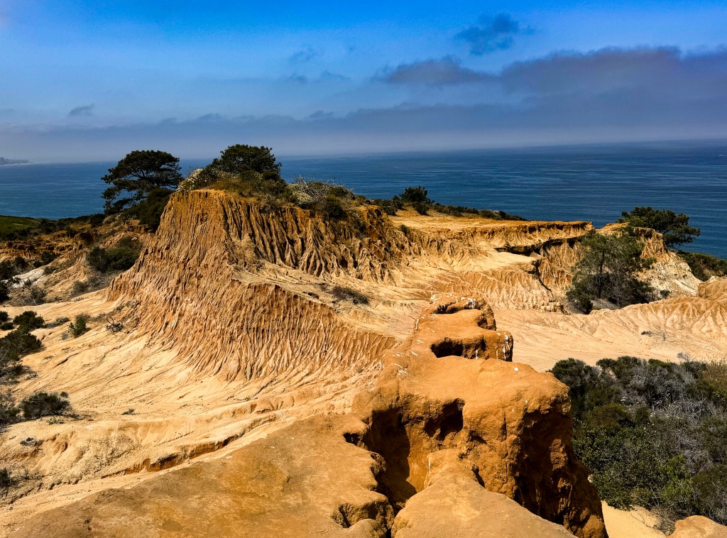 RN: Torrey Pines Natural Reserve is almost 2,000 acres that was set aside in 1899 to preserve the cliffs and beach previously occupied by 4 tribes of pueblo natives (Wiki- what else?). Thank goodness for this! Otherwise the communities of La Jolla and Del Mar would be a contiguous line of development along the coast. It is the only place in the world that a special subspecies of pine tree called the Torrey Pine grows. Torrey Pines have extensive root systems that allow the trees to hang onto the sandstone cliffs of the area. I have great memories of exploring this area when I was a grad student at UCSD between 1975-1980 because it is an easy jog from campus to the preserve.