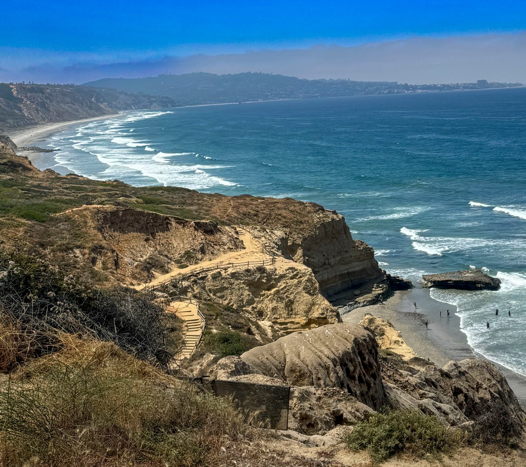 FE: SoCal from north of LA down to San Diego is a sprawl of neighborhoods and strip-malls, fortunately interrupted by large parks and funky beach communities. Today we get to explore both. First, we go for a wonderful hike in Torrey Pines State Natural Reserve. More about the Reserve in Rae’s blog.