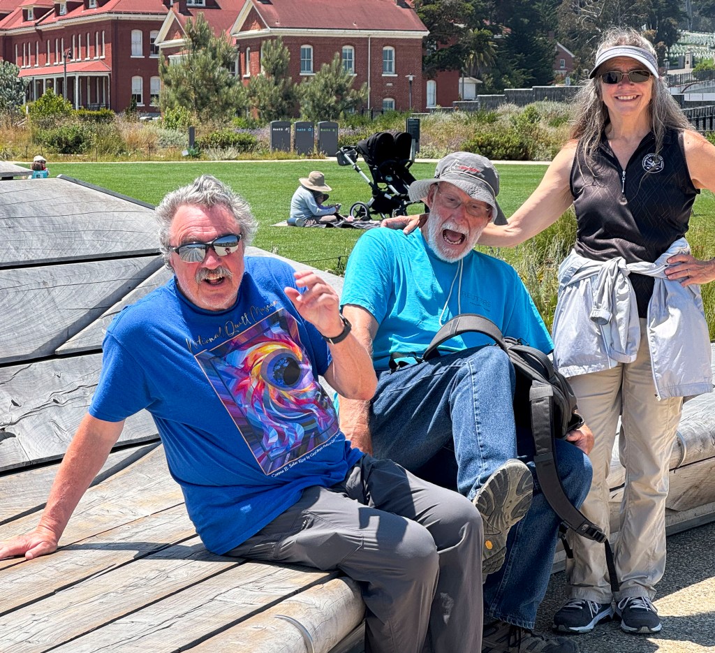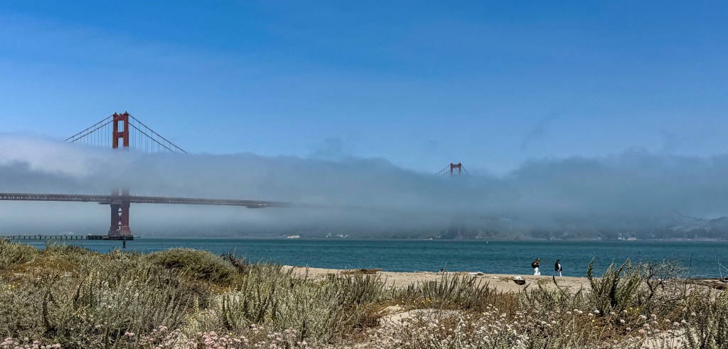 We took a bus with our friends Anne and Greg to the Golden Gate Welcome Center and planned to walk across the bridge, but, alas, the fog enveloped everything and we could barely see the bridge, so we turned the other way to walk through the Presidio to an area called the Tunnel Tops.  Tunnel Tops is a beautiful park built over the tops of two tunnels that guide traffic on US101 to the Golden Gate Bridge.  As we walked away from the Golden Gate, the fog gradually cleared until we could see the two towers of the bridge.