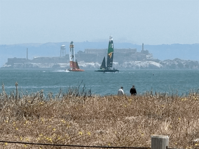 The big hydrofoil sailboats preparing for a race with Alcatraz in the background