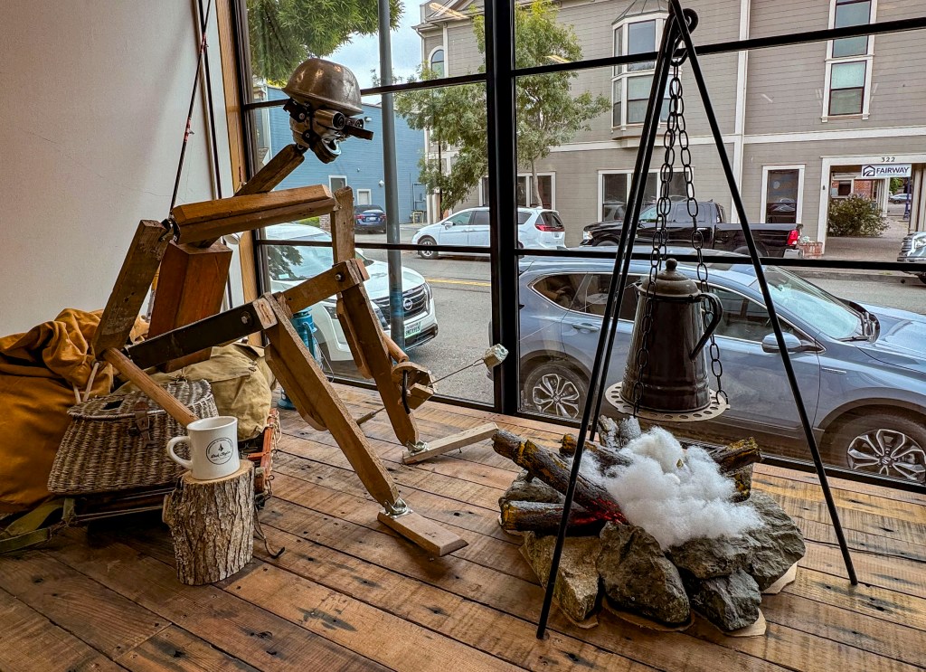 With funky displays, here is a logger preparing his marshmallow in the the Chocolate Factory window