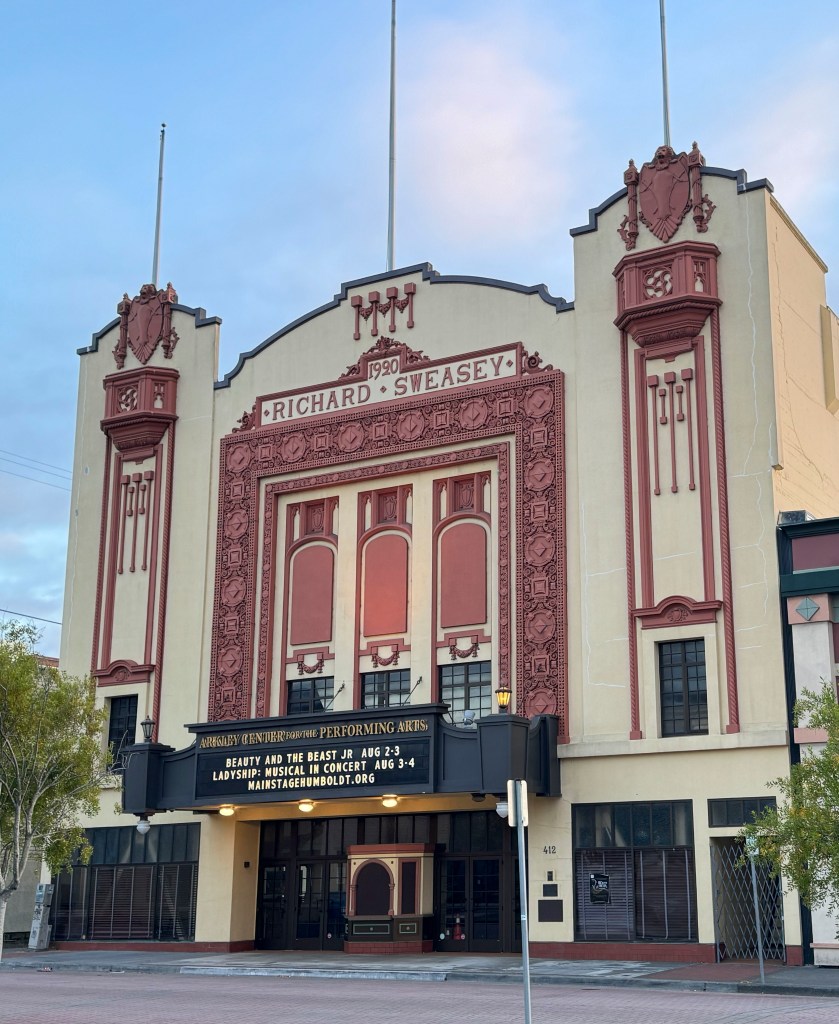 RN: Eureka, with a population of about 27,000 is the largest coastal city between San Francisco CA and Portland OR, and it sits on Humboldt Bay, which is the second largest bay in California. It has a thriving Old Town with beautifully restored Victorian houses and abundant murals. You get the sense of a hippie vibe when you see old guys in long ponytails strolling down the street. There are lots of cool restaurants and bars.