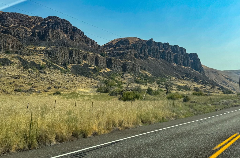 FE: More than a month ago we drove west through the Columbia River Gorge on I-84 on the Oregon side of the river. Today, after more than 8,000 total miles traveled, we are on our first return leg east, driving through the Gorge on the Washington side. WA14 is a much smaller road, winding closely up and down through the enormous lava flows.