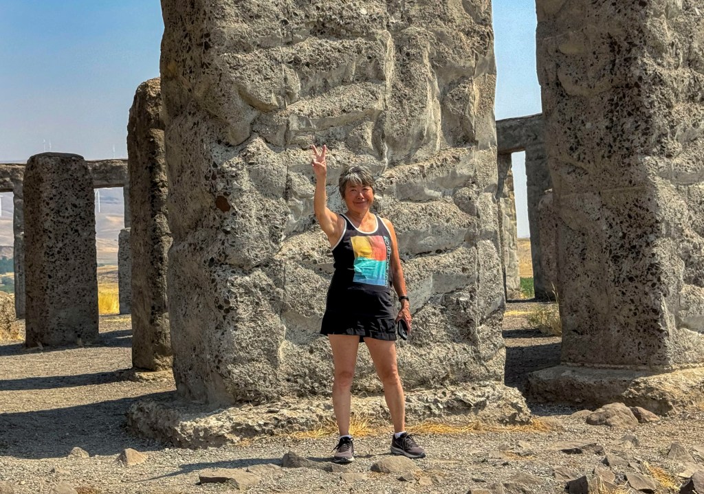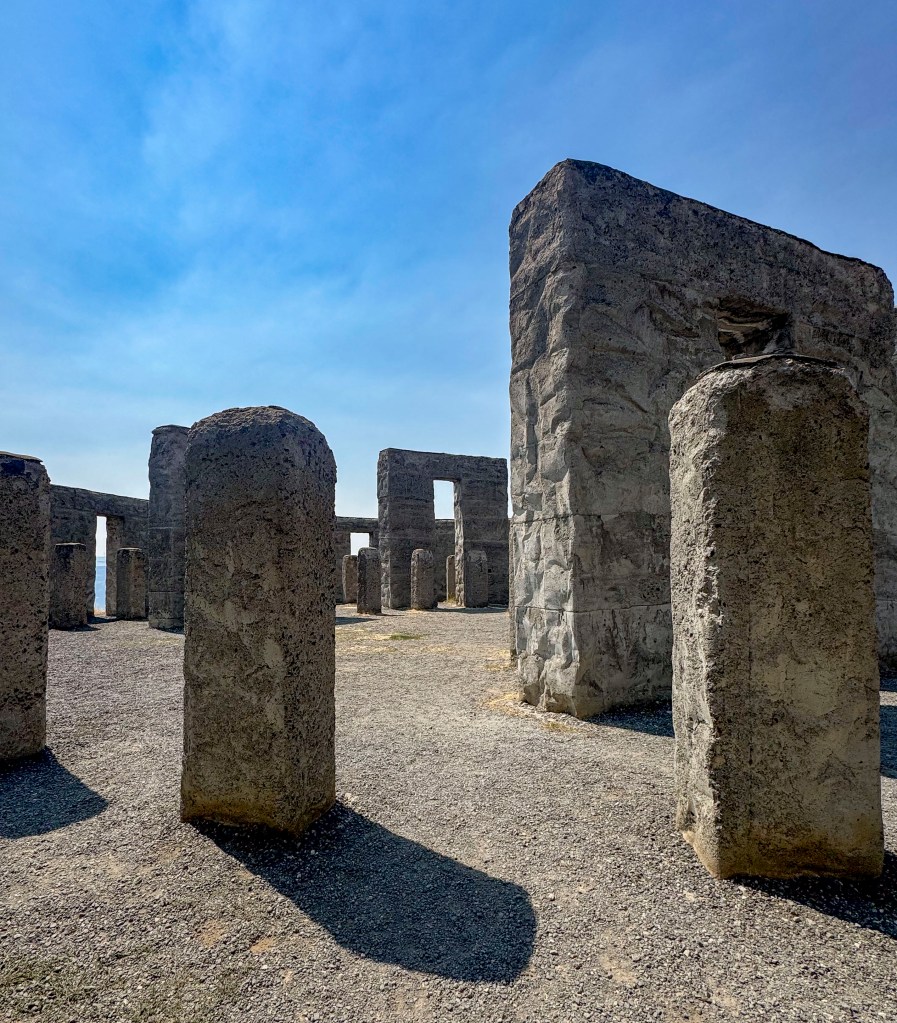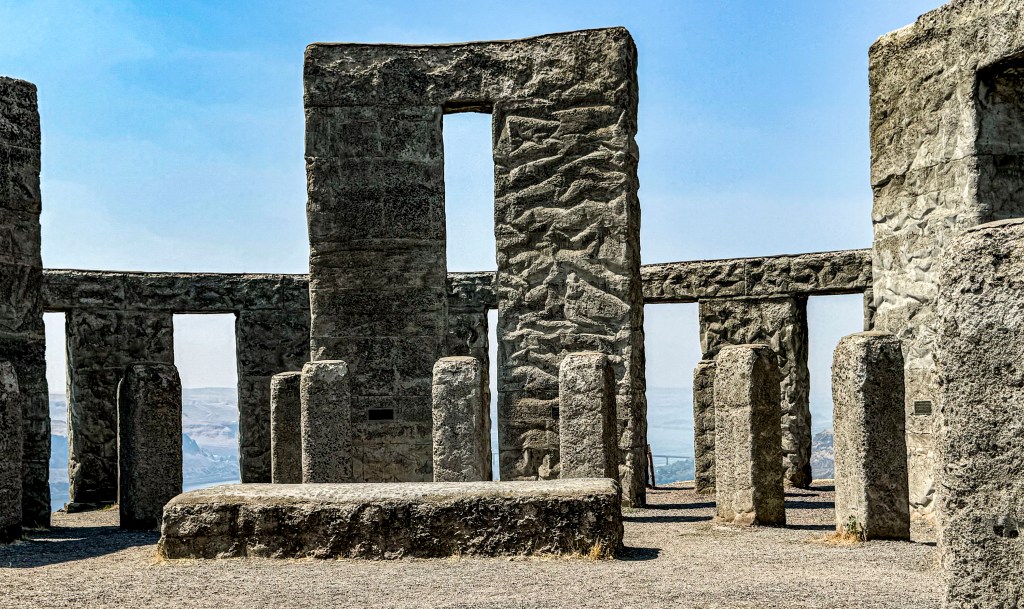 RN: On our way east, we visit a full size reconstruction of Stonehenge in Maryhill WA that was built from 1918-1929 as a memorial to the soldiers of Klickitat County who died in World War I. At the time, it was thought that Stonehenge was a sacrificial site so it was constructed to remind others that humanity is still being sacrificed to the God of War (seen on the plaque at the site).