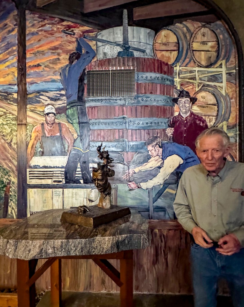 Norm takes us to the inner sanctum of the operation, the library room, where bottles from every wine ever produced here are stored. The room lies about 25 feet below ground, is temperature controlled and well locked! We are so awed that we forget to take a picture. We also walk through the fermentation and aging rooms, where wines from individual plots mature in carefully selected barrels before they are blended into the final product. Below you see Norm standing in front of a mural depicting his partners and the process. One thing that impresses me about him is how much credit he gives to the talent, knowledge and dedication of his partners and workers.