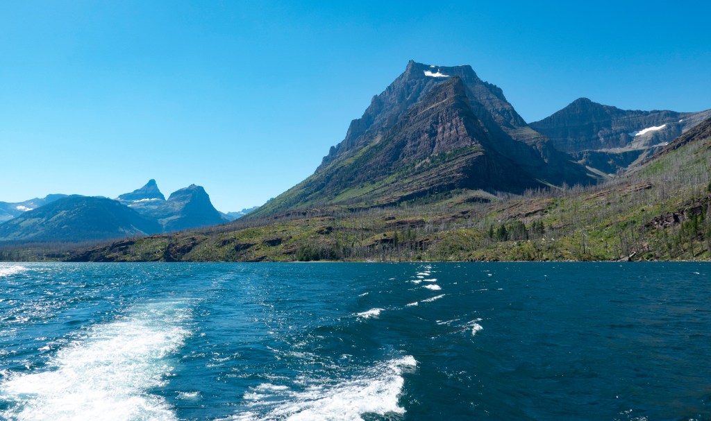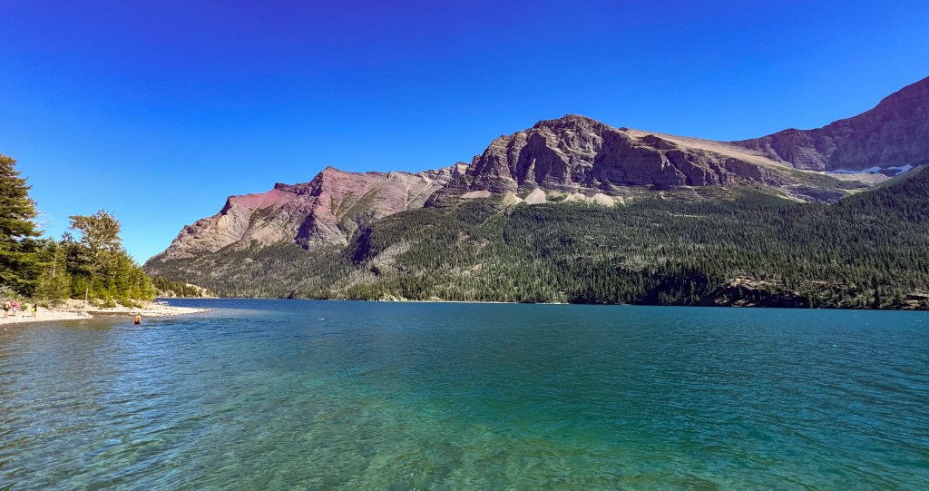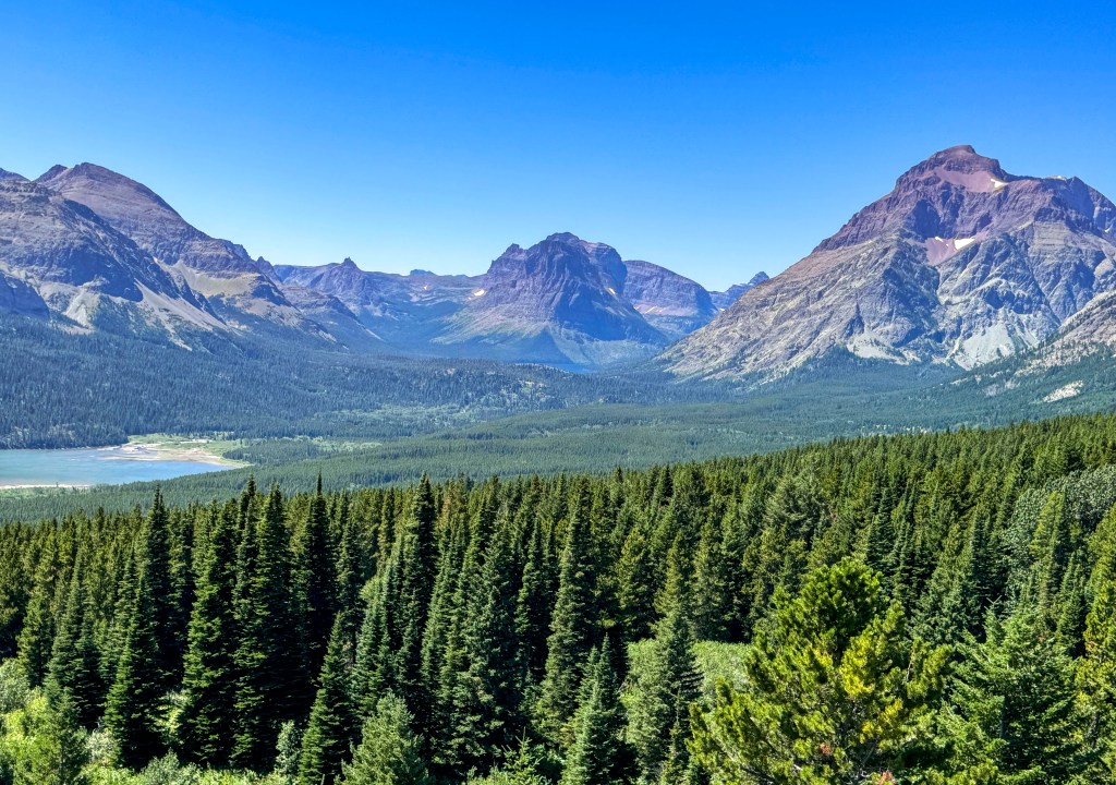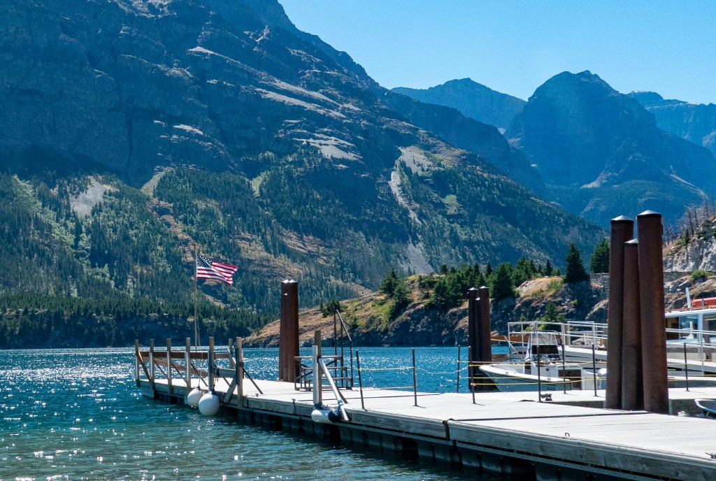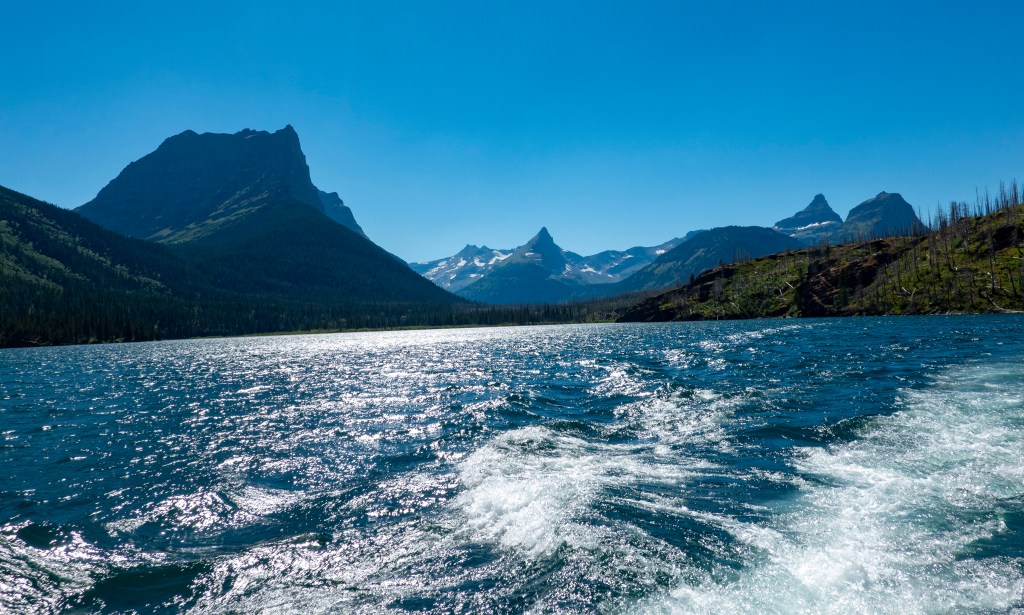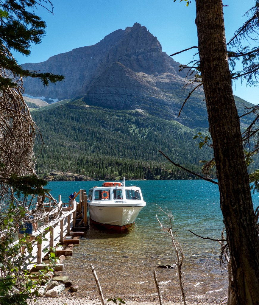 RN: Today we finally make it to Glacier National Park, but, because the NPS requires tickets to enter between 6 am and 3 pm at three of the entrances to the park (and we were unable to get them), we had to drive to Saint Mary, an entrance on the east side, where there was no such restriction.  From our Airbnb in Kalispell, that meant a 123-mile drive just to get to the entrance.  This means that we crossed the Continental Divide heading east on US-2 and we very quickly saw how the character of the Rocky Mountains changes from west to east.  Shortly after we entered the park, we arrived at St Mary Lake for our boat tour. After that, our plan is to drive on Going to the Sun Road, which is a 50-mile-long wonder of construction that crosses the park east-to-west, all the way back to West Glacier.