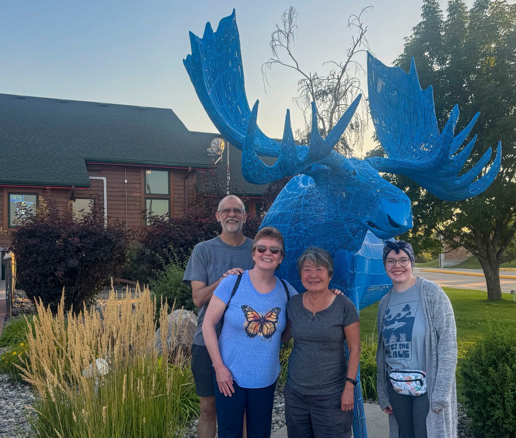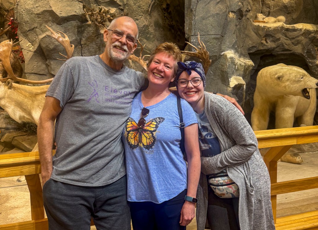 We go out to dinner at a restaurant called the Blue Moose and, afterwards, Diane, her husband Tristan, and their daughter Serena pose in front of the animal display at Cabal’s.