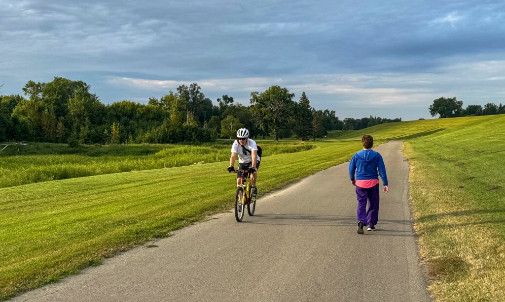 RN: I had a wonderful walk with Diane this morning in Riverside Park- a gorgeous greenway along the Red River. In 1997, there was a disastrous flood in Grand Forks caused by the Red River cresting to 54 ft while sand dikes were built only 49 ft high. The breeching water spread 3 miles into the city because it is so flat and 50,000 people had to be evacuated (Wiki). In response, the federal government worked with the state government to clear the flood plain of development and to create this wonderful park. In addition permanent dikes were built on either side of the river. You can see the bikeway we walked on and, to the right, the gentle slope of the dike (which also serves as a sledding hill in the winter).