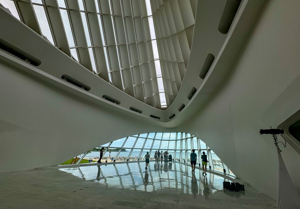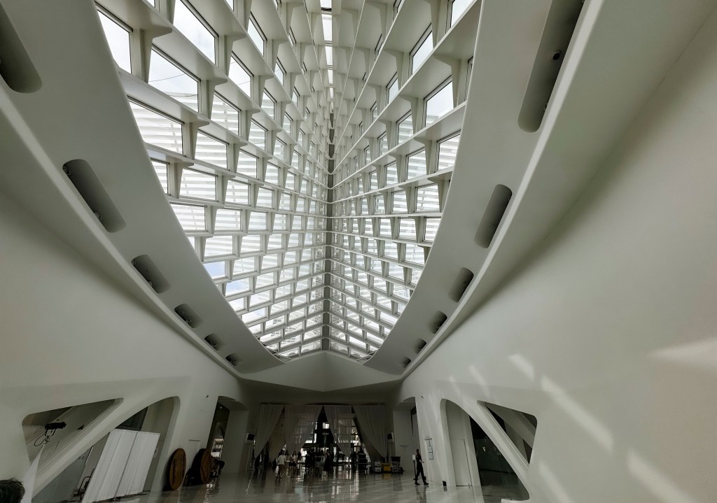 the interior of the hall soars over us little humans and looks out over Lake Michigan