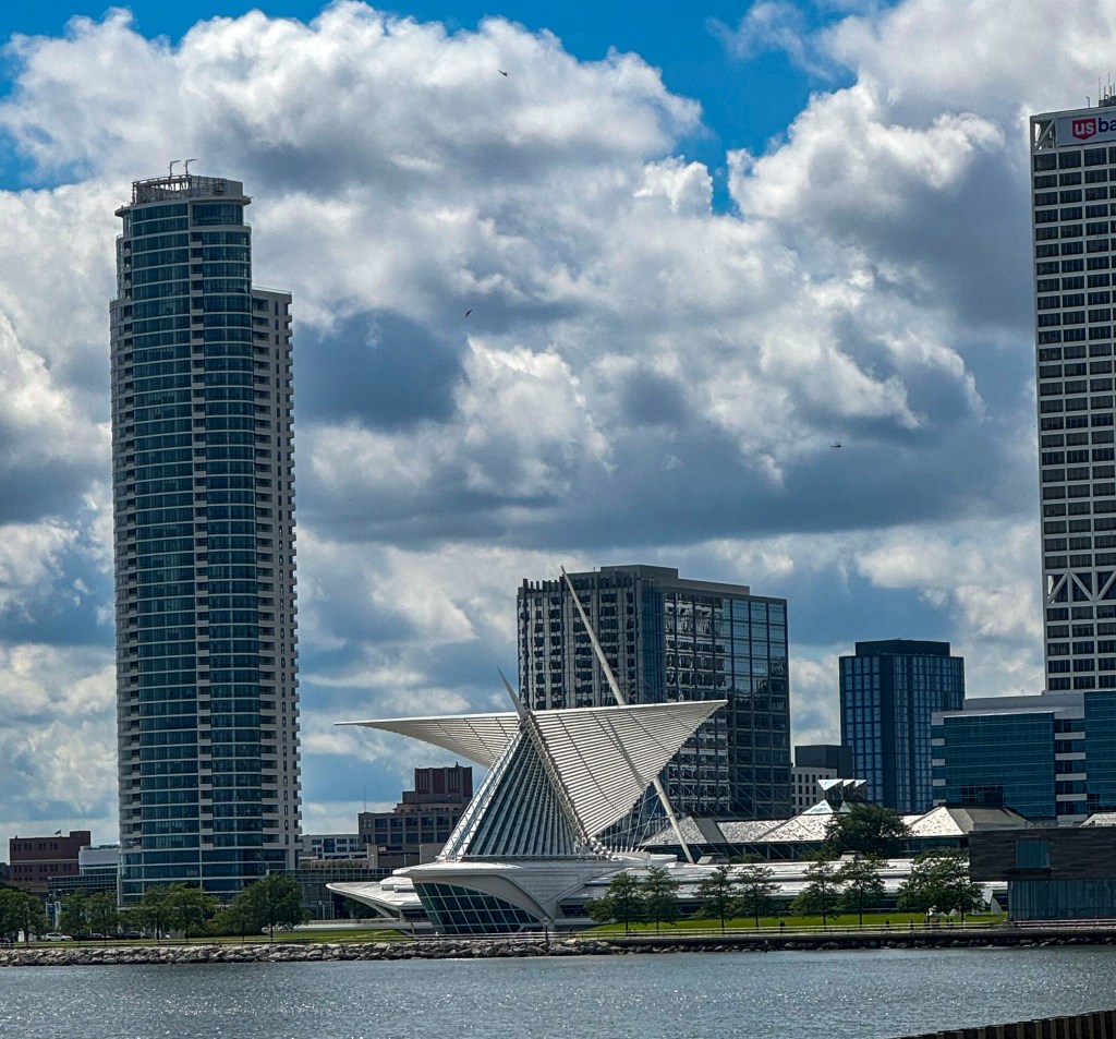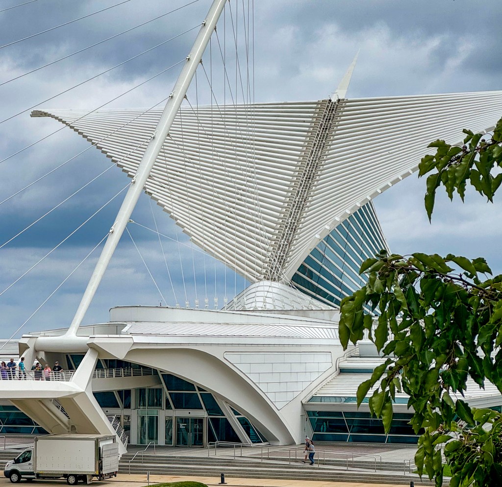RN: Today we start our road trip tour of the Great Lakes, massive fresh-water bodies that define the geography of the northern-midwest. We visit the Milwaukee Art Museum, which is on the waterfront of Lake Michigan. The museum was formed in 1957 and located in the War Memorial Center. New buildings were added in 1975 and, notably in 2001 when the Quadracci Pavilion was added. The Quadracci Pavilion was designed by renown Spanish architect Santiago Calatrava and is pure white, with soaring arches and huge windows that look out over the lake. Notably, it has a Burke briese soleil (fancy name for a sunshade) that looks like giant wings. During the day, the wings open up and, at night, they are closed. At noon, they close the flaps and open them again.