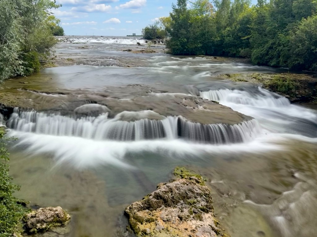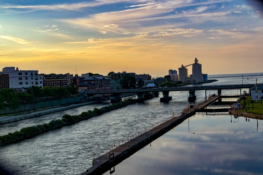 The river connects to the Erie Canal system. The calm water is the canal with a lock at the end, side by side with the rushing river.